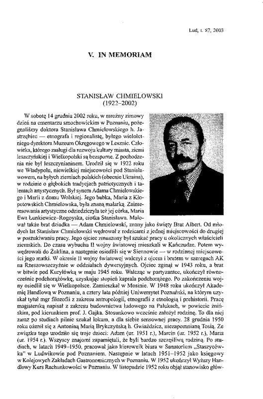 leszczyńskiego (1989) oraz tekstów do przewodników wielkopolskich o muzeum leszczyńskim m.in. Muzea Wielkopolski (Poznań 1969). Publikował także artykuły w czasopismach "Poznaj Swój Kraj" , "Lud" oraz w "Panoramie Leszczyńskiej". Podsumowaniem wieloletnich zainteresowań etnograficznych S. Chmielowskiego jest niewątpliwie