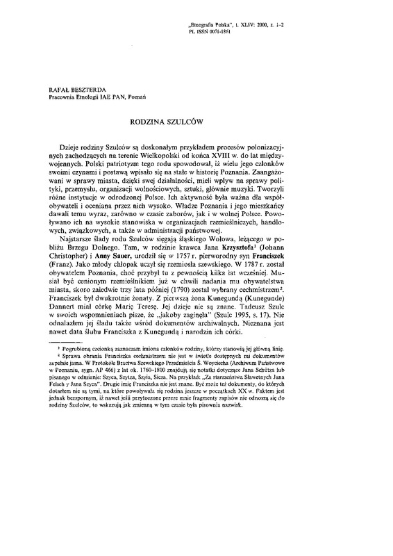Dzieje rodziny Szulców są doskonałym przykładem procesów polonizacyjnych zachodzących na terenie Wielkopolski od końca X V I I I w. do lat między