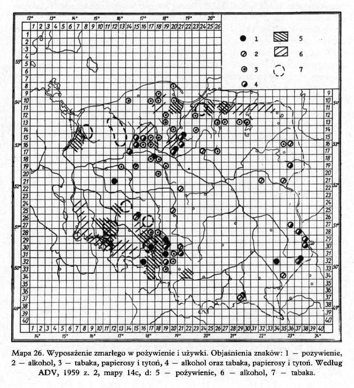 A D V , 1959 z. 2, mapy 14c, d: 5 — pożywienie, 6 — alkohol, 7 — tabaka.
