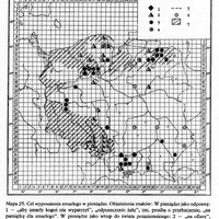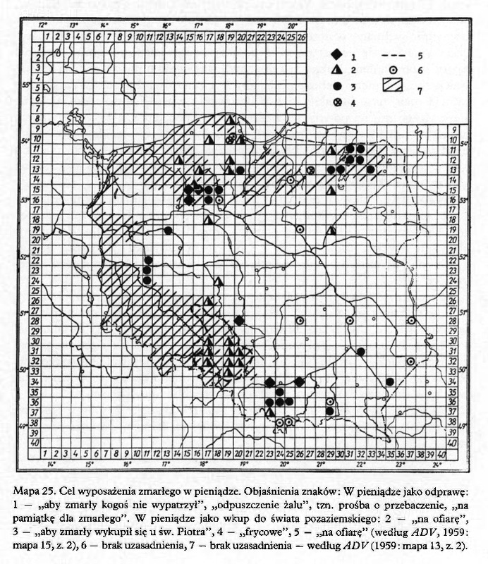Mapa 25. Cel wyposażenia zmarłego w pieniądze. Objaśnienia znaków: W pieniądze jako odprawę: