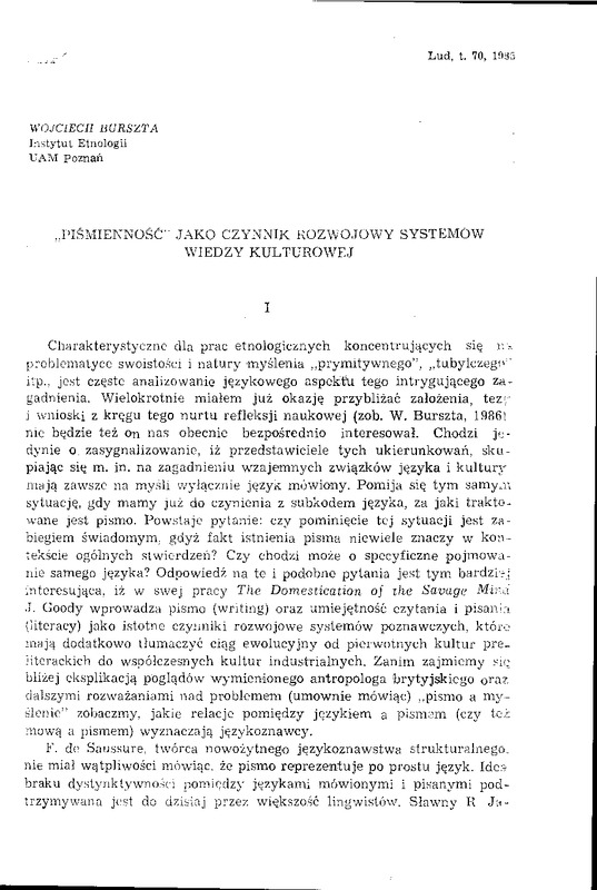 "Piśmienność " jako czynnik rozwojowy wiedzy kulturowej / LUD 1986 t.70