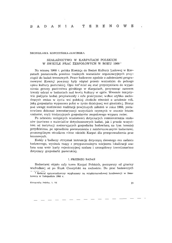 Szałaśnictwo w Karpatach Polskich w świetle prac zespołowych w r. 1960 / ETNOGRAFIA POLSKA 1962 t.6