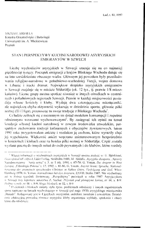 Stan i perspektywy kuchni narodowej asyryjskich emigrantów w Szwecji / LUD 1997 t.81