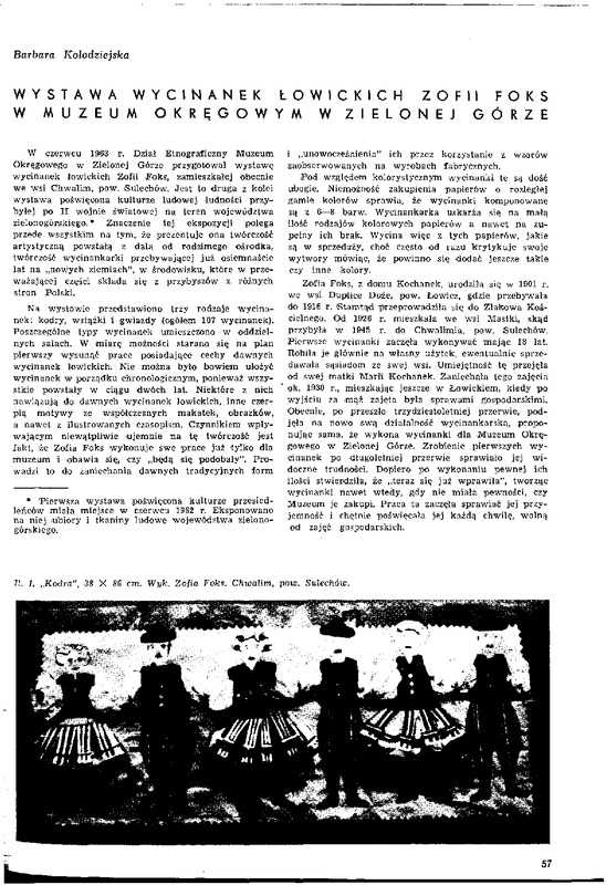 Wystawa wycinanek łowickich Zofii Foks w Muzeum Okręgowym w Zielonej Górze/ Polska Sztuka Ludowa - Konteksty 1965 t.19 z.1