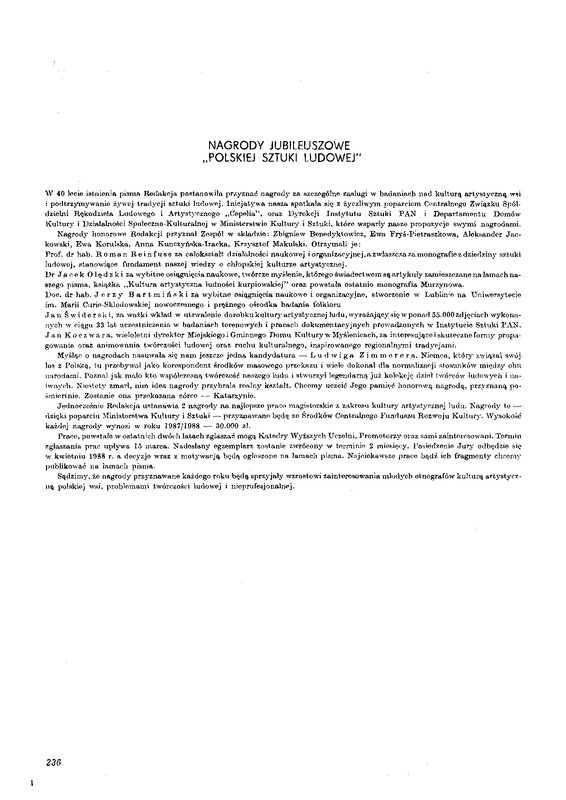 Nagrody jubileuszowe "Polskiej Sztuki Ludowej" / Polska Sztuka Ludowa - Konteksty 1987 t.41 z.1-4