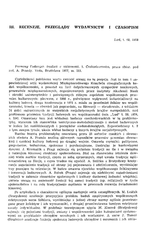 przez 25 autorów czeskich i słowackich otwiera A. Pranda analizą głównych czynników procesów przemian słowackiej i czeskiej kultury ludowej po drugiej wojnie. Omawia czynniki: polityczne,