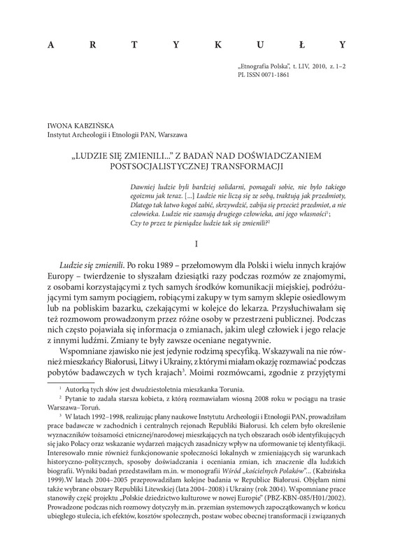 "Ludzie się zmienili"...Z badań nad doświadczeniem postsocjalistycznej transformacji / ETNOGRAFIA POLSKA 2010 t.54 z.1-2