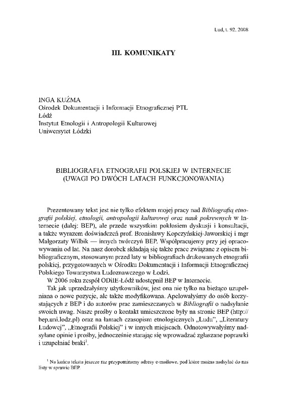 Bibliografia etnografii polskiej w Internecie / LUD 2008 t.92
