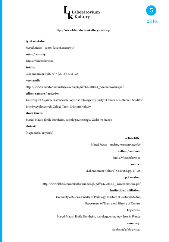 Marcel Mauss – uczeń, badacz, nauczyciel / Laboratorium kultury 5 (2016)